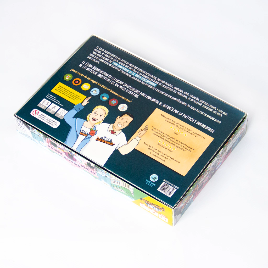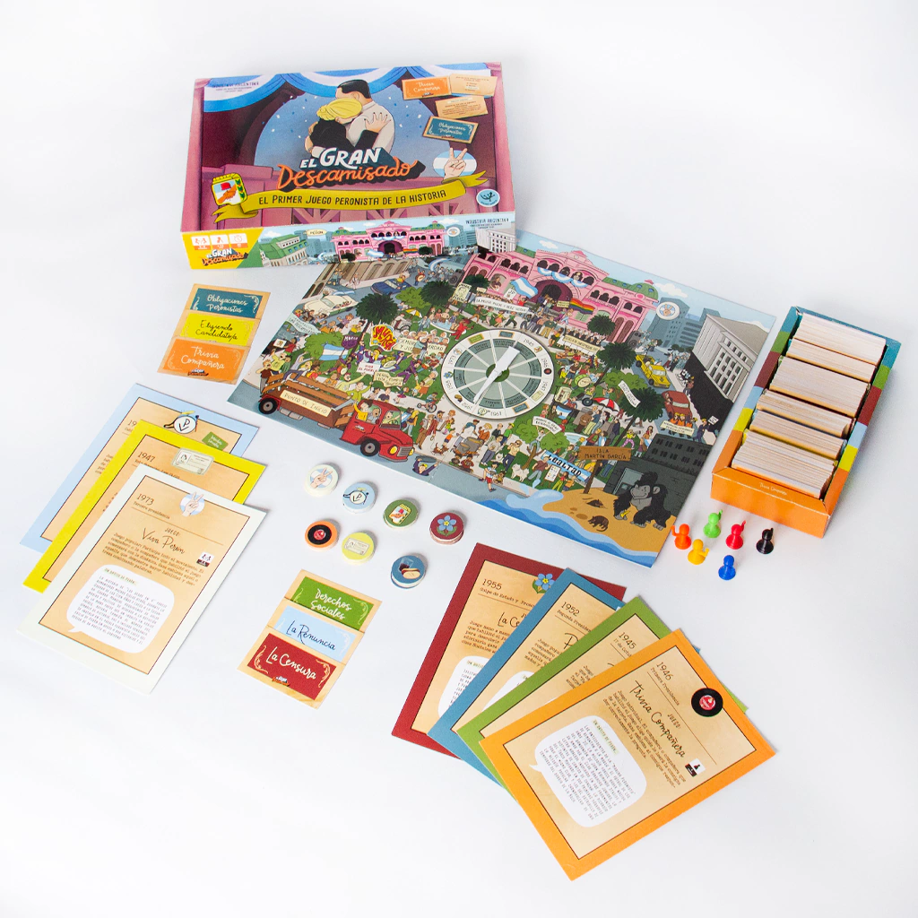 Contiene: Reglamento General / Tablero / 6 peones peronistas / Aguja de reloj histórico / 7 Tarjetones con descripción de juegos / 400 Tarjetas / 42 Emblemas Peronistas
